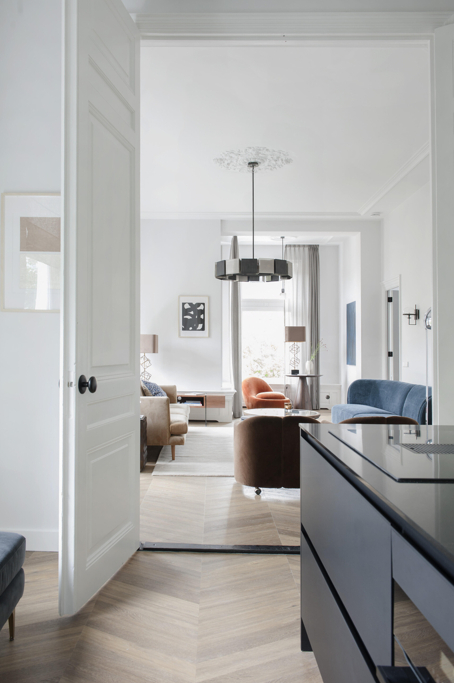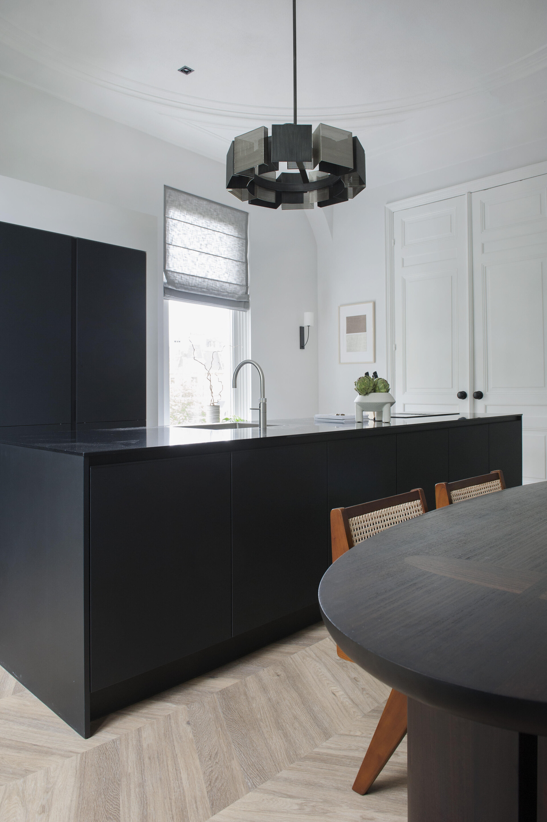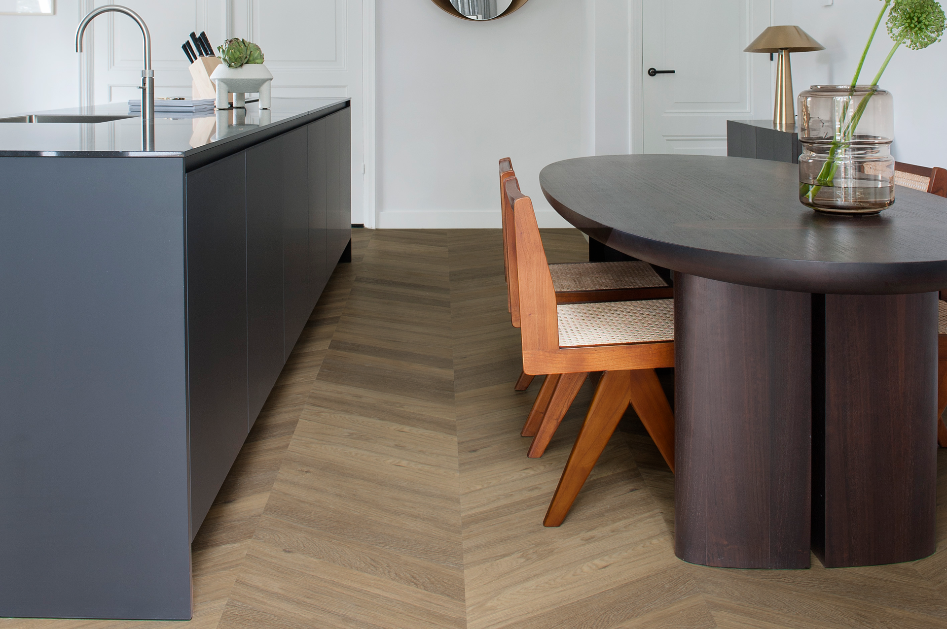 The feeling of home with an elegant atmosphere. The interior of the townhouse contains high-quality elements that coincide to create a luxurious atmosphere. The 6544 Chevron floor comes into its own with its warm dark colour and unique pattern shape.