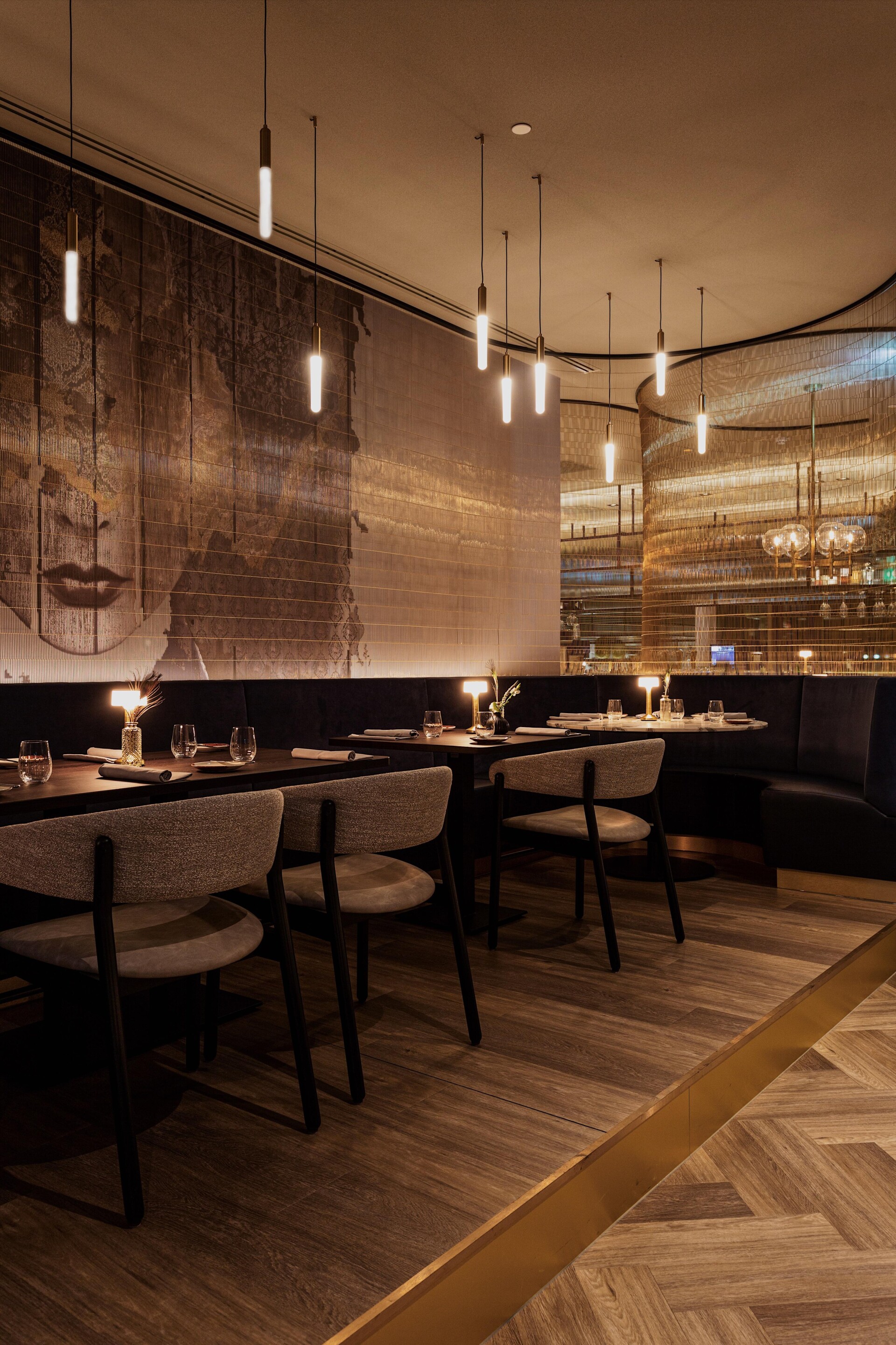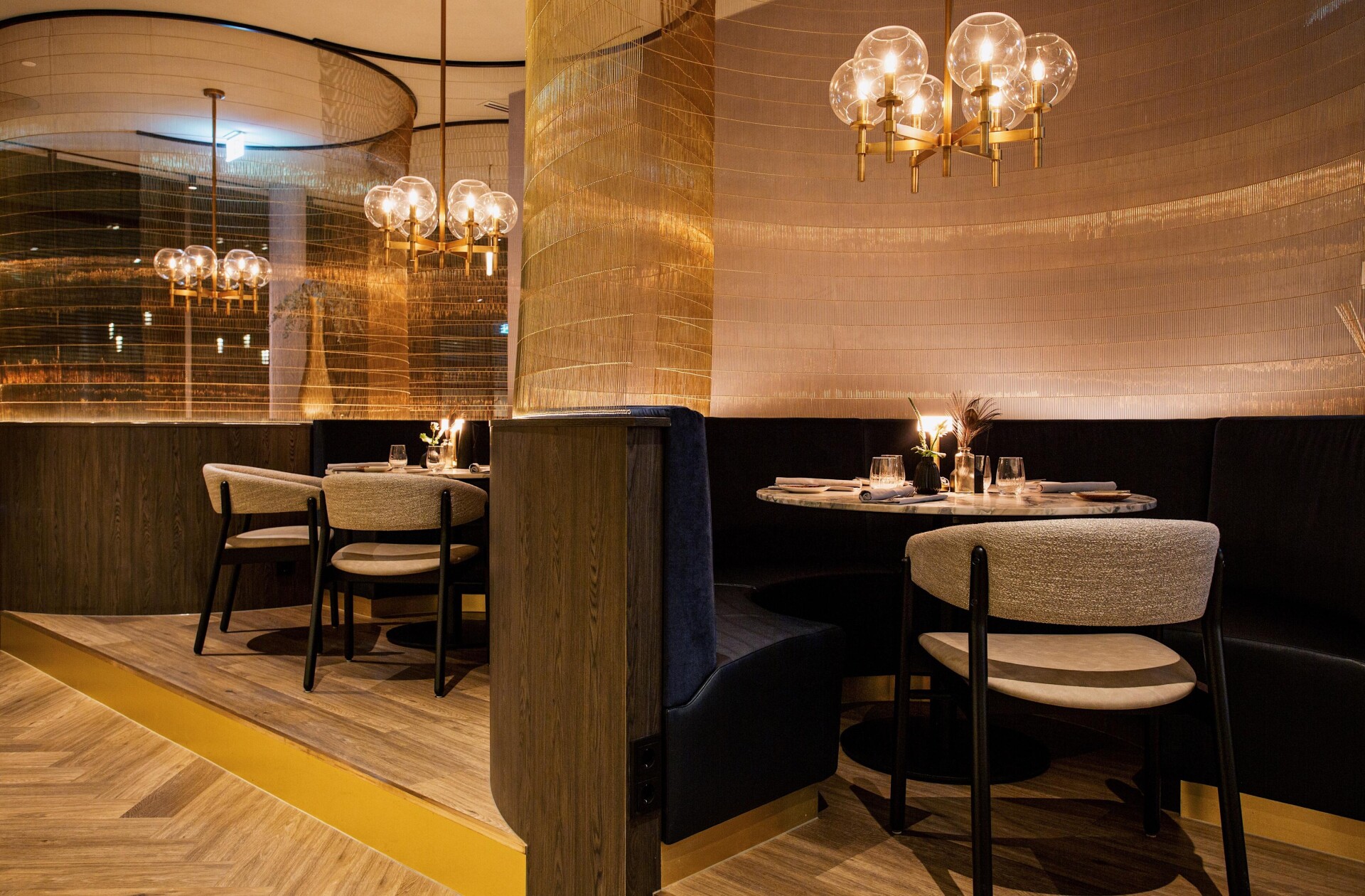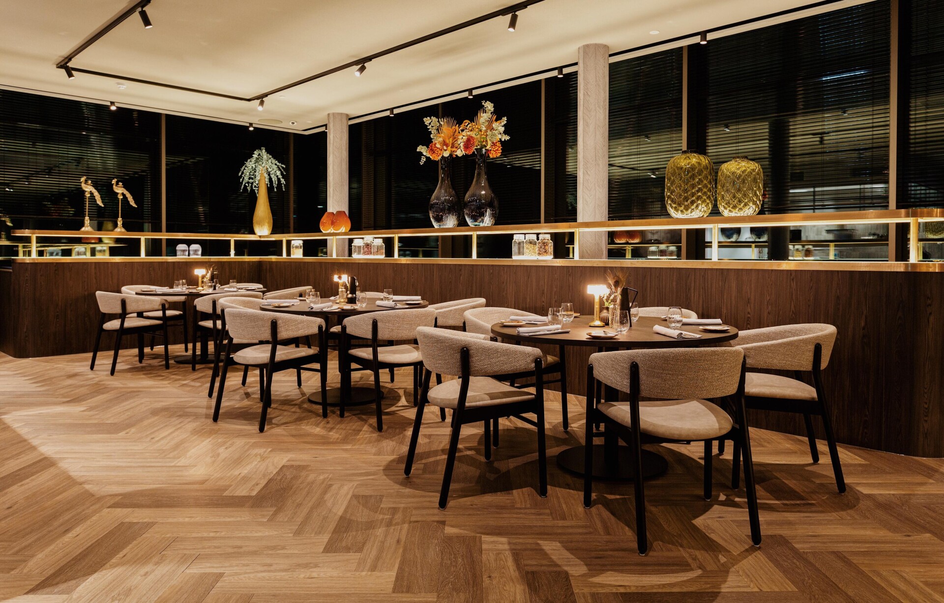 The result of the design by Horeca Sfeermakers is a special interior with the colors dark green, dark blue, corn yellow and gray as a common thread. Therdex 6041 was applied in the project. A quiet, herringbone floor that goes perfectly with the dark marble elements and the striking wallpaper.